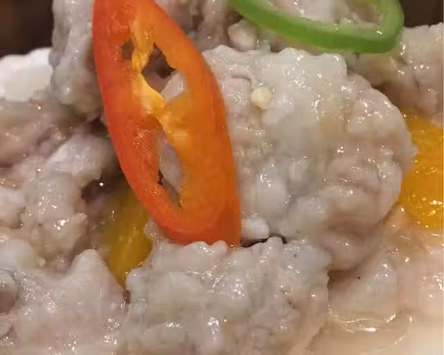 排骨平鋪在南瓜上面,蒸時排骨的油會滴下南瓜,南瓜更香。灑上幾粒陽江豆豉,沒有可免。