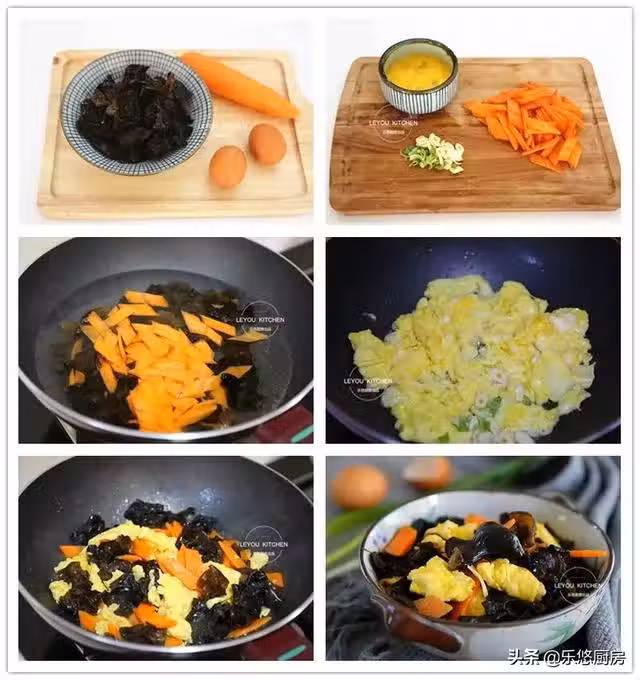第五步:把木耳和胡蘿蔔片放入鍋中,接下來放入半勺鹽、1勺生抽、2勺清水、少許雞精翻炒均勻即可關火。