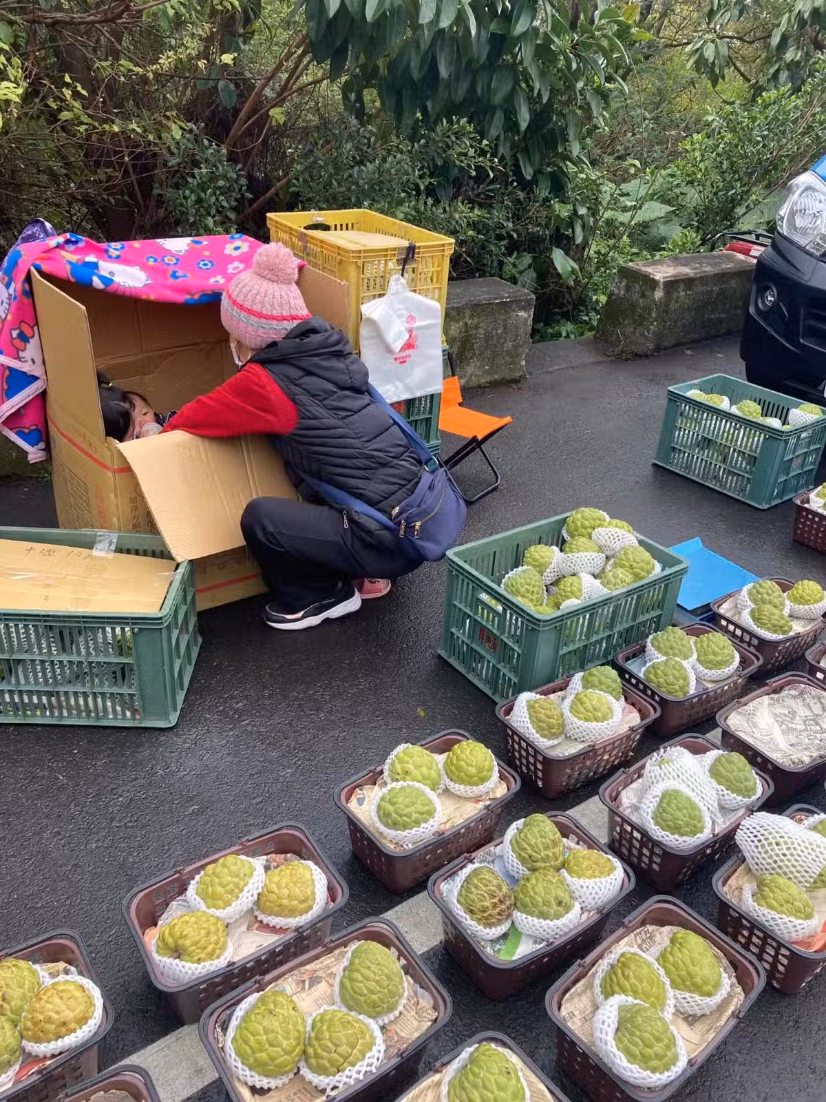 雨天虎頭山擺攤...媽媽頂寒風賣釋迦「讓嬰兒睡紙箱」😭網友心疼「曝光地點」揪團買爆 #詳情見留言 #請大家多幫忙