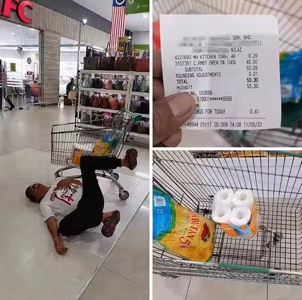 根據面子書群組「Jangan Serius Sangat」分享的帖文,一名男子作狀在超市倒下,一條腿懸在空中,看起來就像暈倒的樣子。
