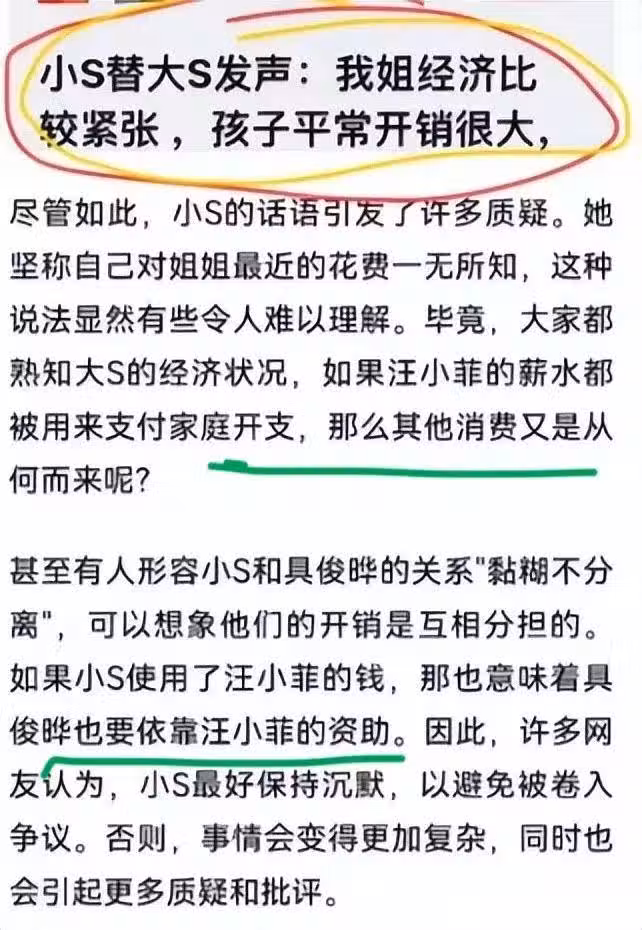 此前,坊間也有消息稱,小S在接受採訪的時候,暗示不出來工作的姐姐大S現在手頭並沒有那麼闊綽。儘管我查了不少資料,都沒有找到這段話的出處。