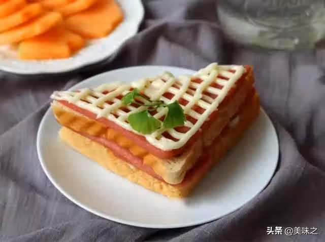 10、三明治出爐後在火腿腸片上擠上適量的沙拉醬,圖案隨意。