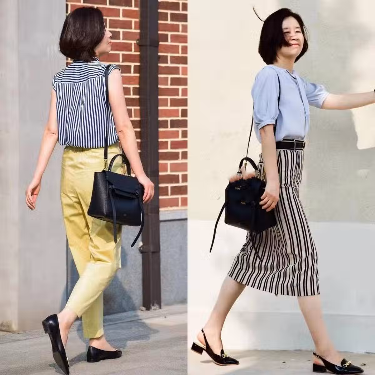 大齡女現在春季穿衣的時候,一定要學會運用好技巧,比如可以讓造型具備平衡狀態的「繁簡結合」,時髦又顯瘦。條紋元素襯衫+純色九分褲or純色襯衫+條紋半身裙,都是很不錯的。