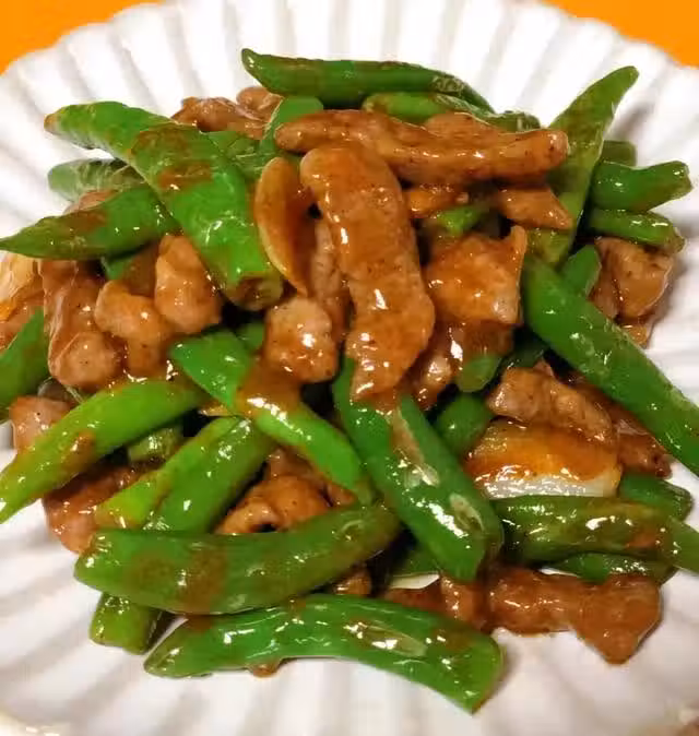 (7)鍋底留油倒入牛裡脊翻炒至變色,倒入杭椒和調好的醬汁大火翻炒均勻。