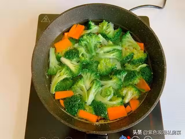 3.鍋中放清水,放一勺食用油,一勺鹽,水開後放西藍花,胡蘿蔔,焯水兩分鐘撈出,水中放油和鹽,西葫蘆翠綠不發黃。