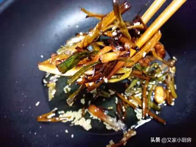 5、前面調好的料這時候就可以倒入鍋里,如果油溫過高,可以先關火再倒料汁,拌均勻就可以了。如果家裡小孩子不吃蔥葉,這時候就可以留出一些不帶蔥葉的醬汁,剩下的醬汁就可以再把炸好的蔥葉重新放回鍋里拌均勻就可以了。