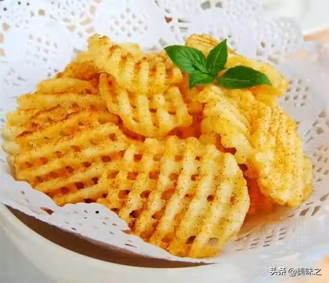7、辣椒粉、黑胡椒粉,混合在一起拌勻,再用濾勺慢慢的、均勻得篩在薯片上,邊篩邊翻動薯片,使每片薯片上都均勻裹上即可。
