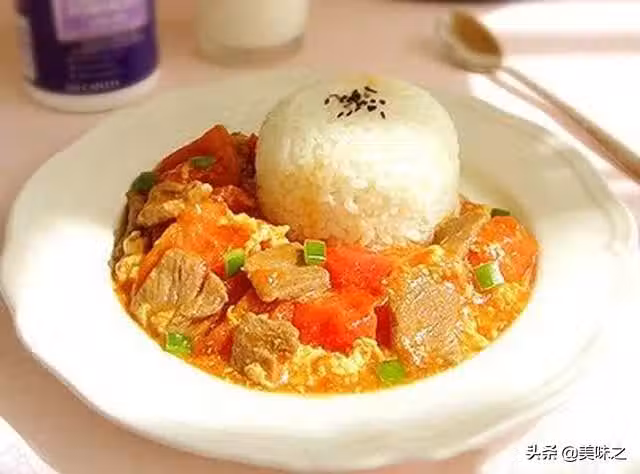 米飯1碗、牛裡脊肉100g、雞蛋1個、番茄2個、蔥小半根、薑片4片、鹽4小勺、料酒2小勺、澱粉0.25小勺、色拉油1大勺、清水半杯、醬油1小勺、白糖0.25小勺、水澱粉適量、香油適量。