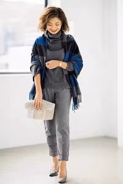 欣賞完這位博主的多套搭配之後,我們能看到她是特別喜歡穿這種顯瘦的西裝褲的,利用灰色高領毛衣配上灰色西裝小腳褲形成了上寬下窄的搭配,對於修飾身形來說特別有幫助,腳上配上一款淺灰色高跟鞋,和上身裝扮形成呼應,給人一種大氣又有氣質的感覺。