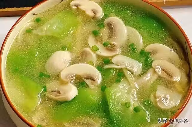 另取湯鍋倒入鮮湯,放入絲瓜、鮮蘑菇、黃酒、鹽,用大火燒開