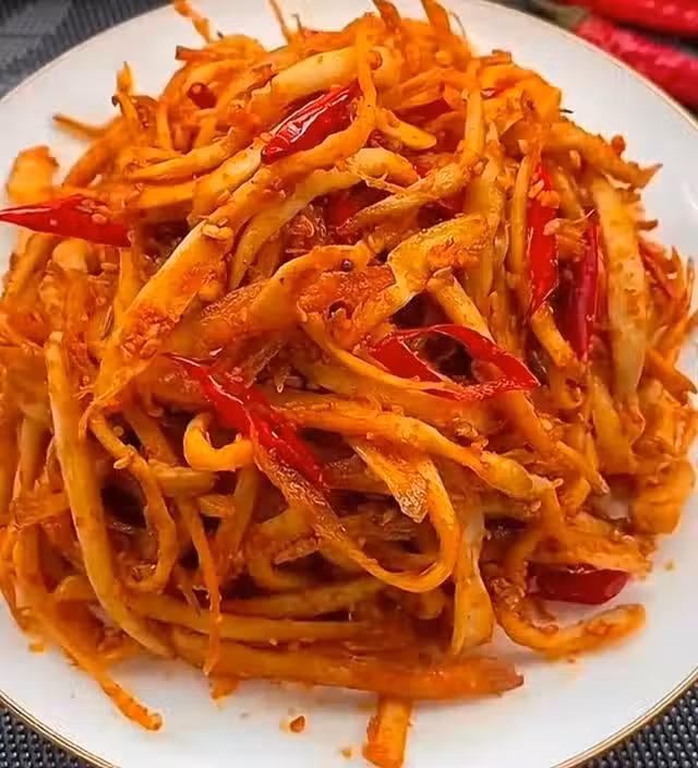 步驟三:鍋中燒油,把杏鮑菇下鍋煸炒干水分,加入蒜末、干辣椒、燒烤料、喜歡孜然味的也可以加點孜然,繼續煸炒入味即可。香辣入味,個人感覺非常好吃。