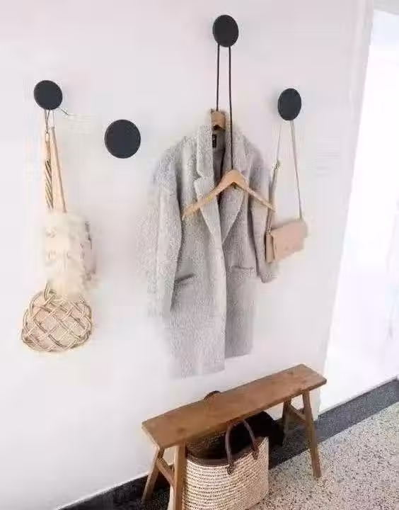 掛鉤設計簡單,經濟實用。假如臥室小到不可以再額外添置凳子了,何不就在墻壁釘一排掛鉤。包包衣服褲子帽子圍巾全都掛在墻壁,直接運用墻面的室內空間去收納整理,一點也不占地。而且價格還不貴,操作還簡單。