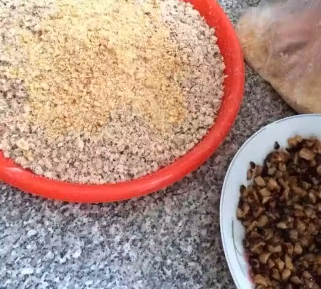 白豆蒸好錘砸成細碎,花生也一樣,將兩者混合!