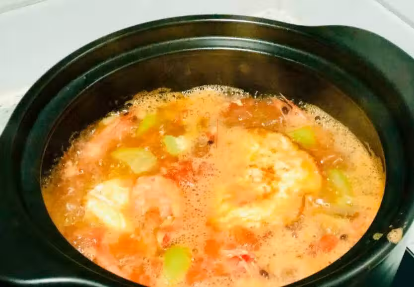 番茄炒出湯汁之後,加入足量的開水,下入大蝦、絲瓜、荷包蛋,大火燒開之後轉小火燉上10分鐘左右。+++