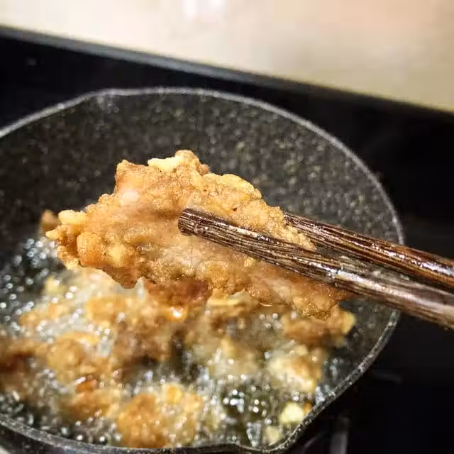 3、炸制過程中火候很關鍵,炸制定型再翻面攪動。