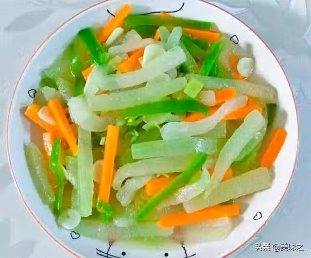 5、然後加青椒斷生,加冬瓜胡蘿蔔翻炒,澆上碗汁,撒上蔥花,淋點香油就可以了。
