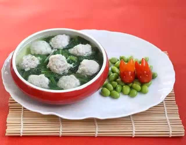 裡脊肉 200克,菠菜 60克,大骨湯 2000毫升,鹽 適量,料酒 5克,胡椒粉 1克,蛋清 1個,澱粉 30克。
