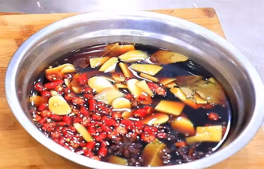 切點小米椒圈、大蒜片,生薑片一起放晾涼的碗料裡面。