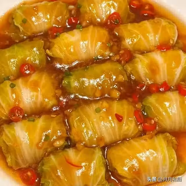 5.把肉餡放入白菜內捲起來,整齊地擺入盤中,然後放入蒸屜中蒸熟。