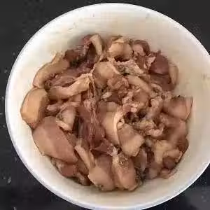 5、無水的冷鍋中鋪上五花肉,用中小火,慢慢熬,直到五花肉邊角捲起微焦。美味的椒鹽五花肉就完成了。