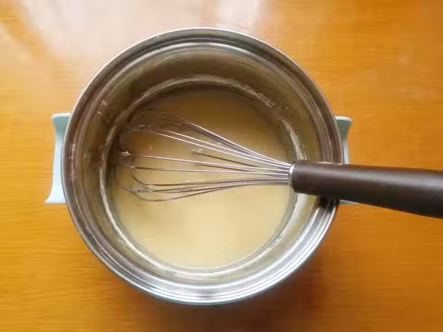 3、然後我們加入牛奶,充分攪拌均勻。加入牛奶後麵糊會變得有點粗糙,這是正常現象無需擔心,等加完蛋黃後就會變得細膩了