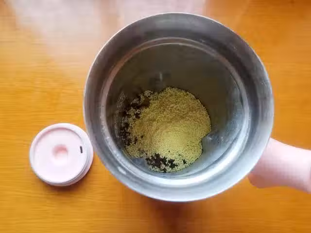 6、打好的椒鹽用網篩過篩一次,這樣會得到更細膩的粉末,過篩完後留下的粗顆粒可以倒回料理機繼續攪打