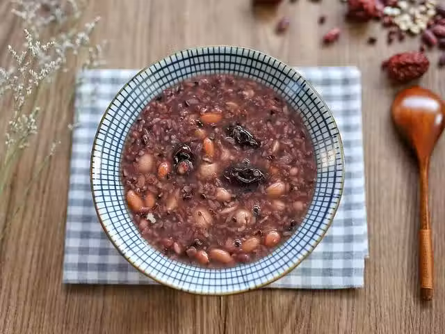 材料:花芸豆30克、糯米120克、紅豆30克、蓮子60克、紅棗12個、花生30克、黑米50克、薏米20克、冰糖適量