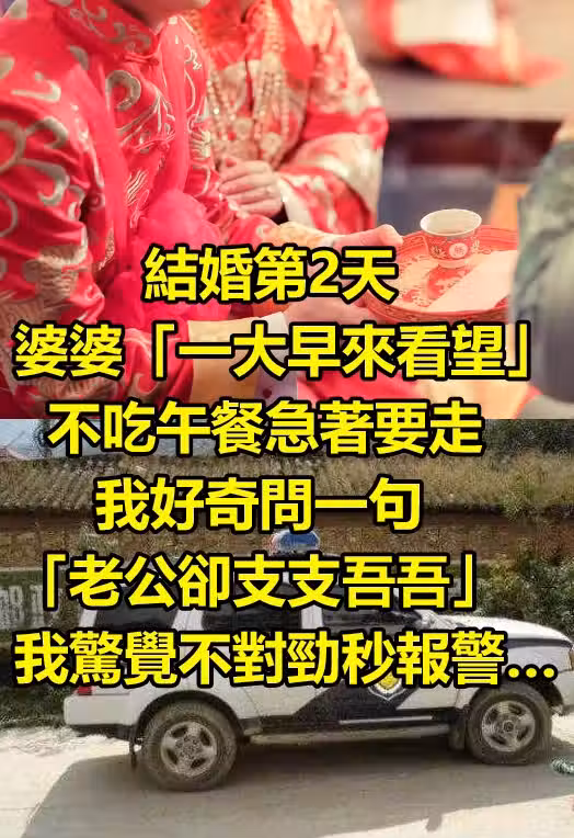 結婚第2天,婆婆「一大早來看望」不吃午餐急著要走,我好奇問一句「老公卻支支吾吾」我驚覺不對勁秒報警…!