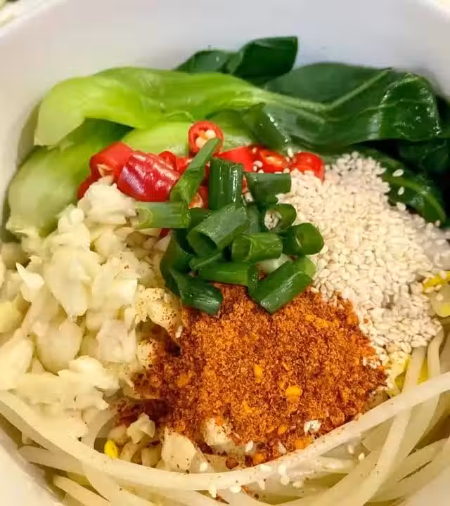 餃子皮,青菜,豆芽,蒜末,小米辣椒,蔥花,白芝麻,香辣蘸料。