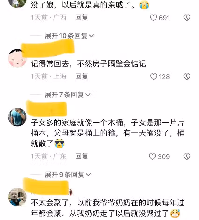 對此有網友說,子女多的家庭就像一個木桶,子女是那一片片桶木,父母就是桶上的箍,有一天箍沒了,桶就散了。