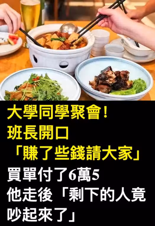 大學同學聚會!班長開口「賺了些錢請大家」:買單付了6萬5 他走後「剩下的人竟吵起來了」