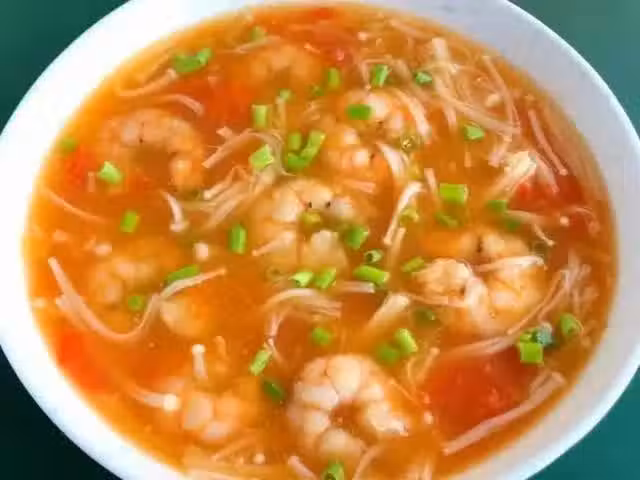 番茄、金針菇、鮮蝦、蔥花、胡椒粉、食用油、料酒、食鹽、雞精、清水