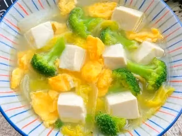 (3)鍋中留油,爆香蔥段、薑片,加入清水煮開,加入西蘭花、娃娃菜、豆腐煮2-3分鐘,時間到後加入雞蛋、食鹽、雞精輕微攪拌煮1分鐘左右即可。