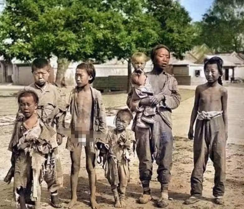 對於當時的老百姓來說, 在收成不好的時候,天天吃頓飽飯都是一個比較艱難的事,圖片中孩子的年齡都不大,但是他們的眉頭卻各個緊皺,就連他們身上的衣服,也都是破爛地不像樣。