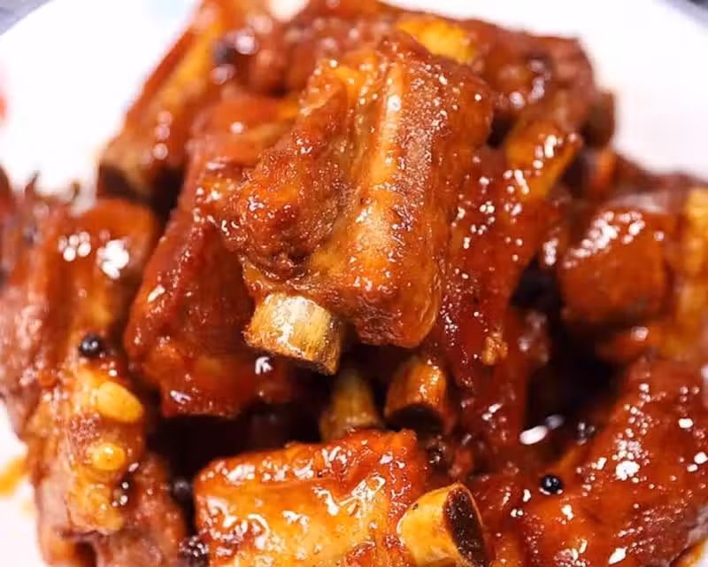 排骨500克、冰糖30克、蔥段1段、薑片4片、蒜3瓣、八角2個、花椒10來粒、