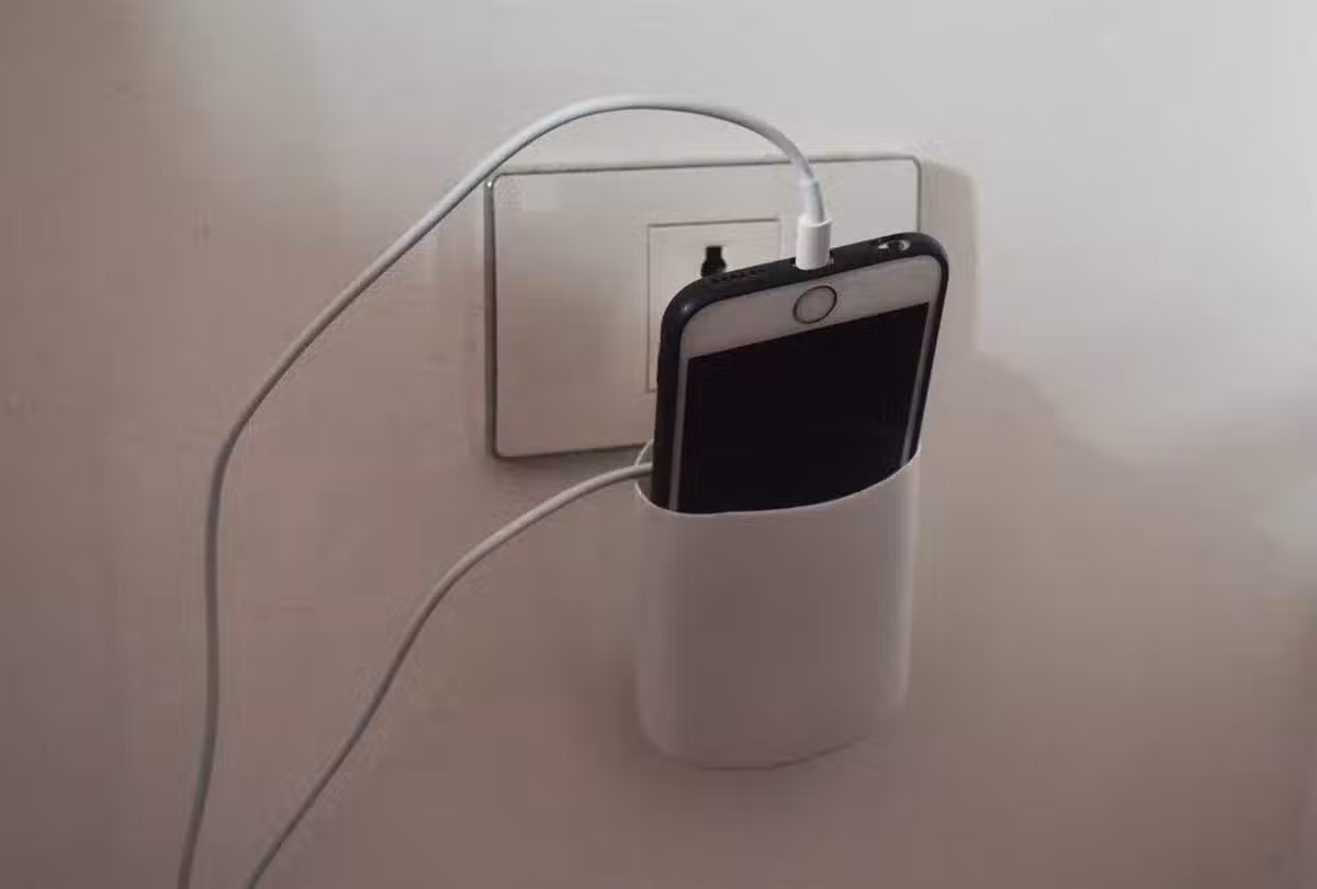 手機充電時,如果遇到插座太高,就可以用到這個神器了。先將手機充電頭插在插座上,然後把改造好的收納神器掛在充電頭上,之後連接資料線,把手機放在收納神器裡就可以解放雙手了。
