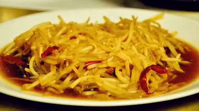 3.接下來改大火,將豆芽放入,接著淋入生抽,烹入白醋,快速翻炒。