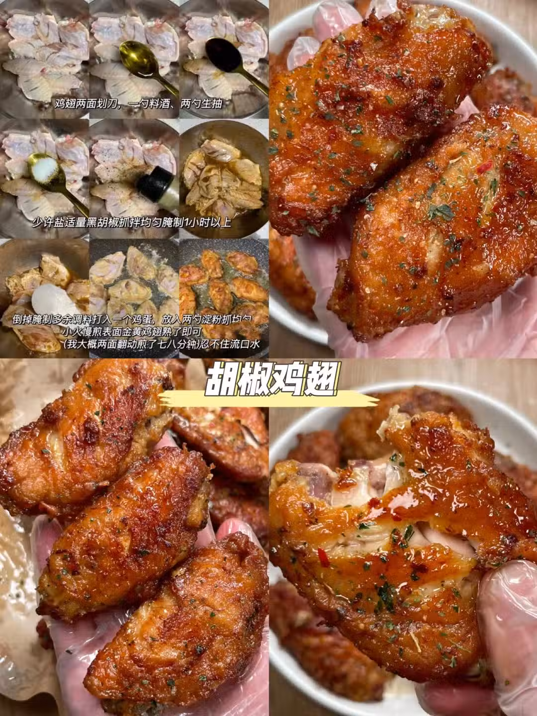 開始製作胡椒雞翅前,先將雞翅清洗乾淨,然後用刀在雞翅表面划上幾道口子以便入味。在一個大碗中,將雞翅與鹽、黑胡椒粉、蒜末、生抽和料酒混合,均勻抹上調味料後腌制30分鐘。腌制期間可翻動幾次,讓雞翅更均勻吸收味道。然後,在熱鍋里加入少許油,將雞翅兩面煎至金黃色,再加入少量水,蓋上蓋子燜煮,直至水分收干、雞翅變得軟爛。最後,撒上適量的胡椒粉,翻炒均勻,即可出鍋上盤。