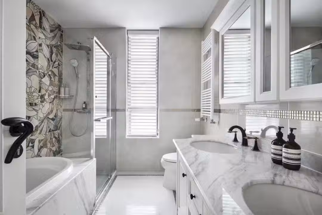 ▲這款淋浴房裝了在牆角,旁邊是嵌入式浴缸,另一邊是洗手台與馬桶,中間隔著過道,整齊有序。衛生間以淺色係為主,同時又花磚作為點綴,也不覺得單調,反正功能齊全,超實用。