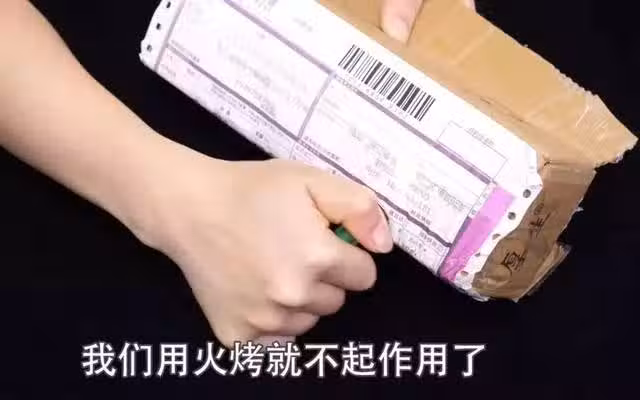 方法二:打火機,現在的電子面單都是熱敏列印紙,它是一種特殊材質,當遇到200度以上的高溫時,紙張就會瞬間變成黑,但它並不是被火燒黑的,而且是一種高溫化學反應,那這個方法的優點是方便快速省時省力,缺點是不能去除普通快遞面單的信息