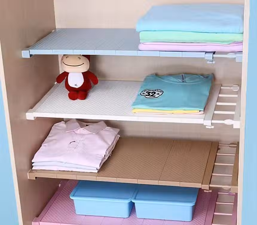 免釘,可伸縮的安裝方式,能根據柜子的寬度調整隔板的長度,非常簡單。除了衣櫃,還可以用在各種柜子內部,層高可以隨時調節,很靈活很方便。