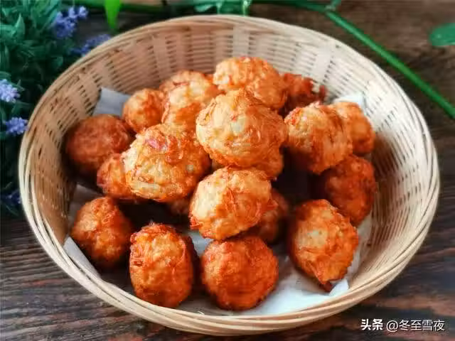 8.鍋內加入油燒熱,把丸子分批炸制,不要一下全放進去,把丸子逐個下入油鍋內炸制,把丸子炸制定型後,再用中小火炸制,開始丸子會沉底,隨著慢慢變熟會浮起來的,顏色變金黃,將丸子撈出,瀝凈油,素炸丸子就做好了。