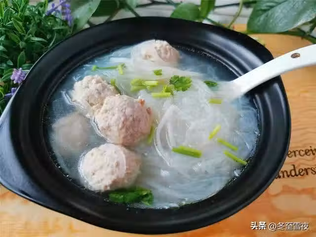 【蘿蔔丸子粉絲湯】所需材料:白蘿蔔半根、豬肉150克、粉絲1把、香菜1棵、雞蛋1個、香油1湯匙、蔥1段、姜1塊、白鬍椒粉1茶匙、料酒半湯匙、