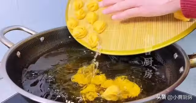 第十步:先給它炸個10秒先讓它定一下型,再用筷子輕翻動全程開中小火炸制,炸至完全漂浮起來以後,再用漏勺的底部輕微的打轉使其受熱均勻,直至給它炸製成這種顏色金黃且表皮非常酥脆的狀態,就可以控油給它撈出來了。