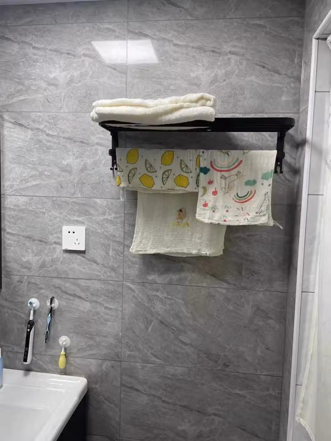 如果陽台不方便晾曬,必須掛在浴室的話,建議選擇安裝電熱毛巾架,用過的毛巾浴巾,快速烘乾後,第一時間收到櫃子裡,避免因潮濕產生的異味和細菌。