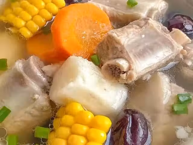3、把排骨、胡蘿蔔、玉米、山藥、紅棗和薑片放入湯鍋中,加入足量的清水,蓋上蓋子隔水燉煮兩個小時。