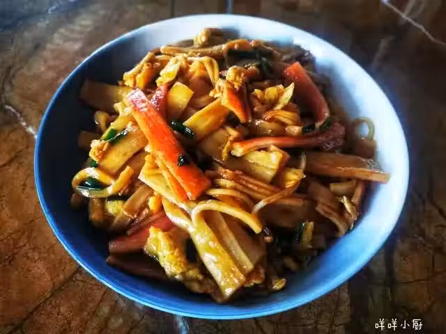 5、倒入調好的醬汁,加入雞蛋塊,一起翻炒均勻,咕嘟咕嘟幾分鐘,讓蟹棒和雞蛋塊都吸足湯汁的味道。