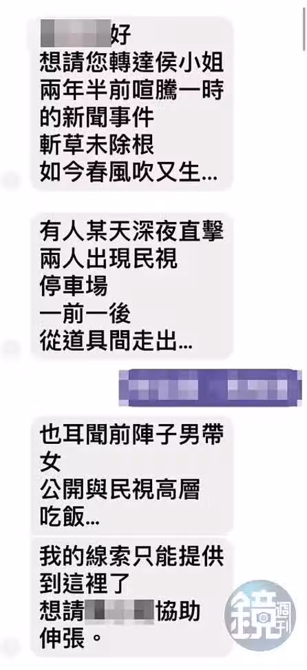 爆料者詳述,小三當時所受處分,僅是從戲劇部門調離其他單位,依舊在民視任職,這讓侯怡君遲遲無法釋懷,「只要小三人還在民視,她永遠就會是侯怡君心頭上的一根刺」。而侯怡君得知此消息時,也驚訝回應,「我很相信我老公,我們幾乎都在一塊,除非他有分身!」,並要求爆料者提供證據佐證。而蕭大陸也表示,「怡君問我時,我一點都不慌張,說帶小三跟高層吃飯,至少說出是哪個高層嘛?太扯,莫須有、莫名其妙」。