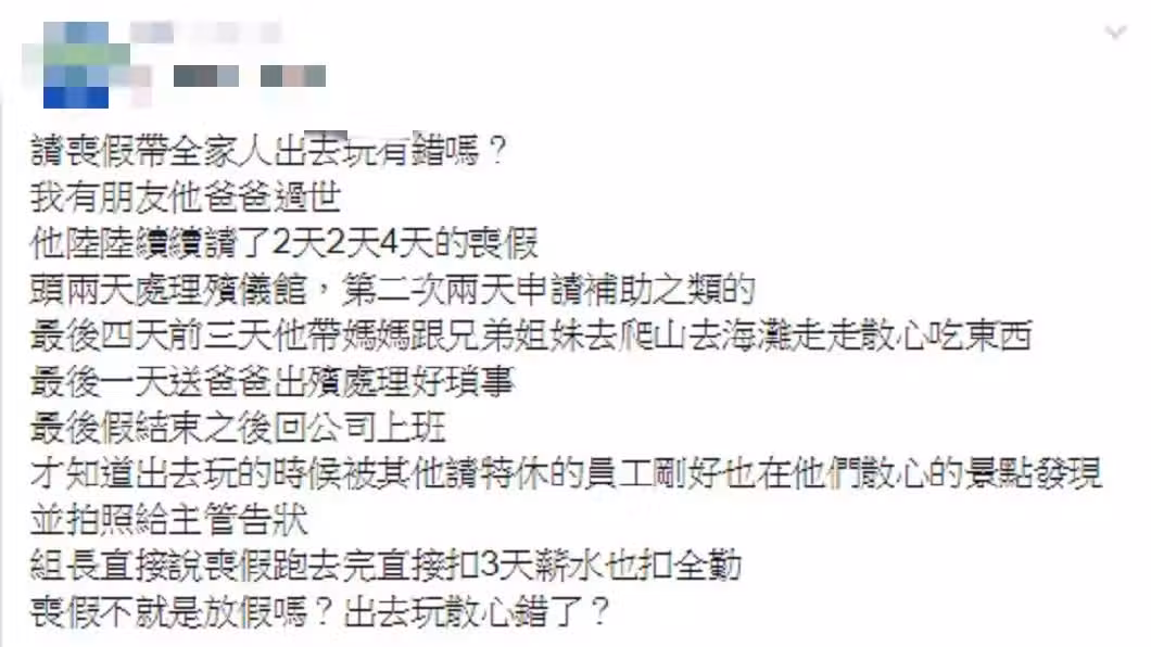 這篇貼文立刻引起熱烈討論,許多網友都替原PO朋友抱不平「去哪裡還要寫報表嗎」、「管人家喪假怎麼用,違反規定了嗎」、「那個組長可能沒經歷過相同事情,不知道悶久了會出事」、「管很寬,這些人住海邊膩啦」、「有沒有同理心啊,組長至少做決定前可以問一下啊。」、「勞基法規定的假,公司扣3天薪水也扣全勤直接違法」、「真的被扣的話,支持去勞工局投訴」、「公司管太多,管人家怎麼用,那是勞基法規定的假,公司要扣,可以直接向勞工局申訴了」、「就是有這種愛告狀的人」。