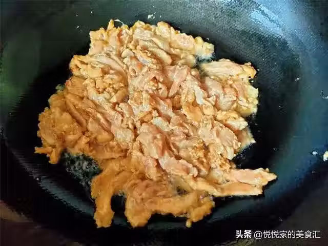 【第三步】:另起鍋燒燙,放食用油,把腌制好的雞胸肉倒入鍋中快速地炒散,炒熟之後先盛出來或是拔到鍋子的一邊,